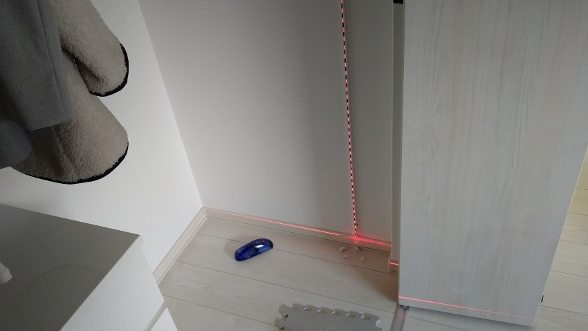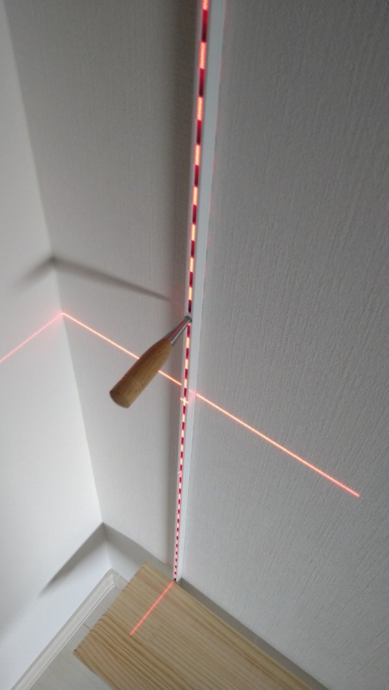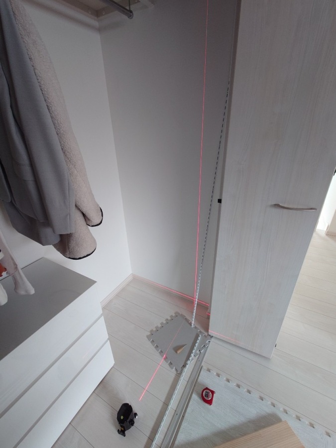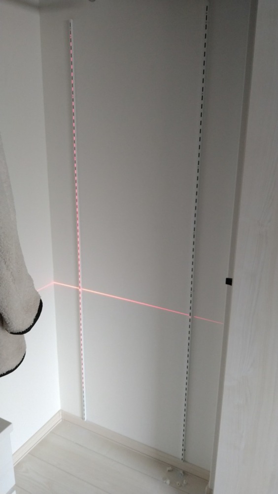 下地センサーを使い柱を探してからレーザー墨出し器を使用し垂直にレールをネジ止めしていきます。