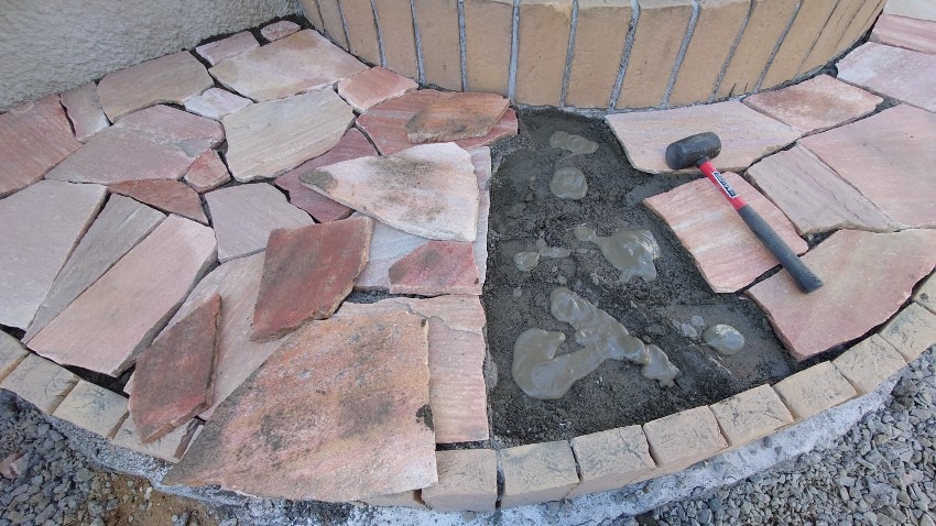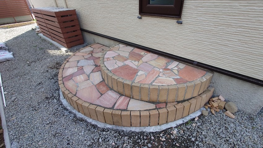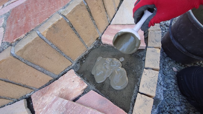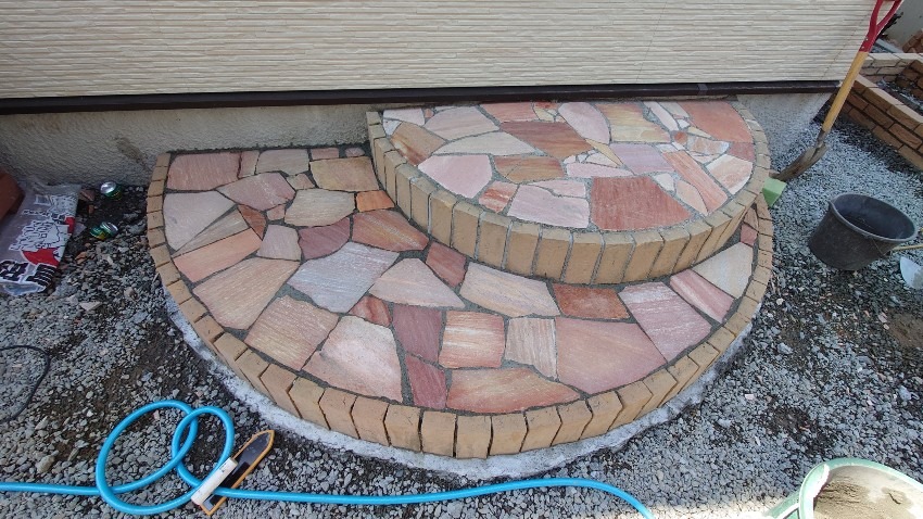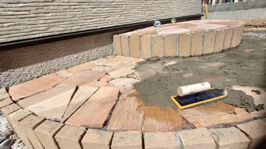 乱形石の隙間にモルタルを入れ込んでいきます。