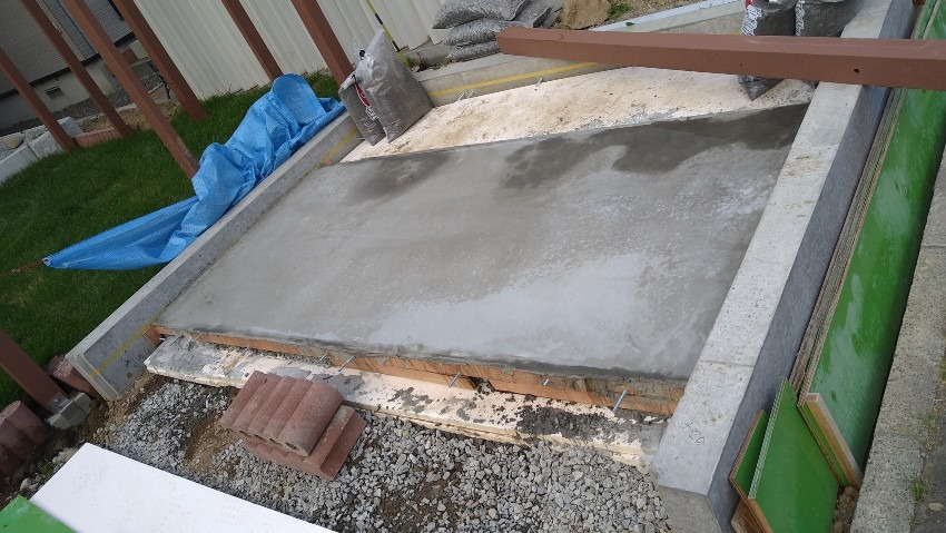 1回目のコンクリートは型枠の上まで打設しないで表面が固まった後にレベラーを流し込みました。