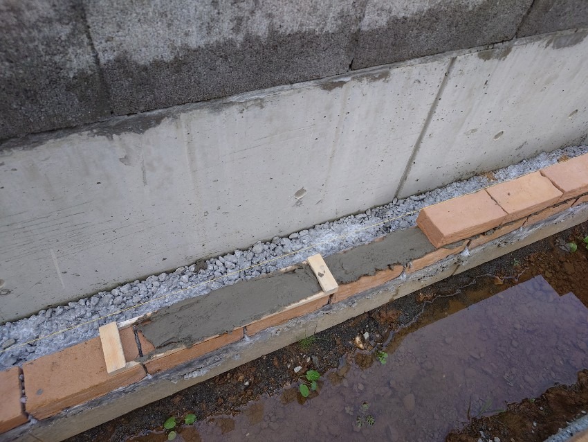 角だけ積んでおいたのはレンガを積む際に真っ直ぐに積めるように水糸を張りたかった為です。