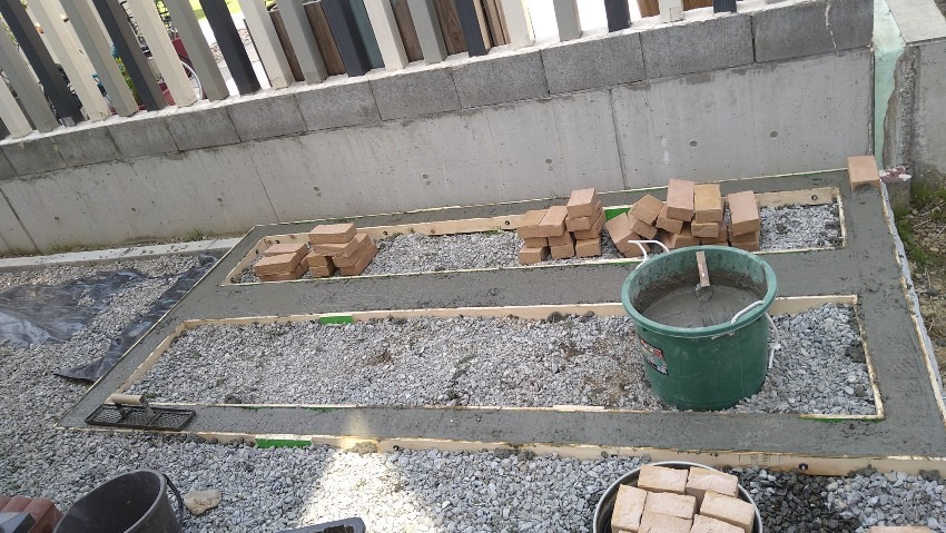 コンクリートが固まる前にレンガを置いていきます。