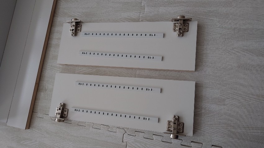 まずは側面の板に可動棚用レールとスライド丁番を取り付け。