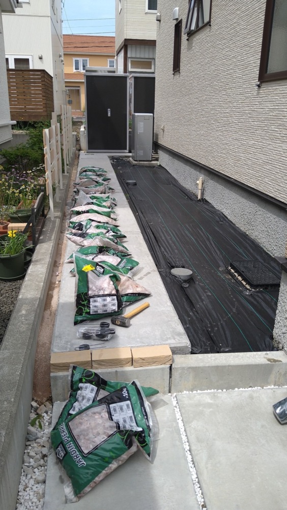 化粧砂利を敷く前にさらに防草シートを敷きます。