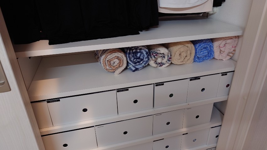 洗濯機の前にはクローゼットが有りバスタオルもこのように収納しています。